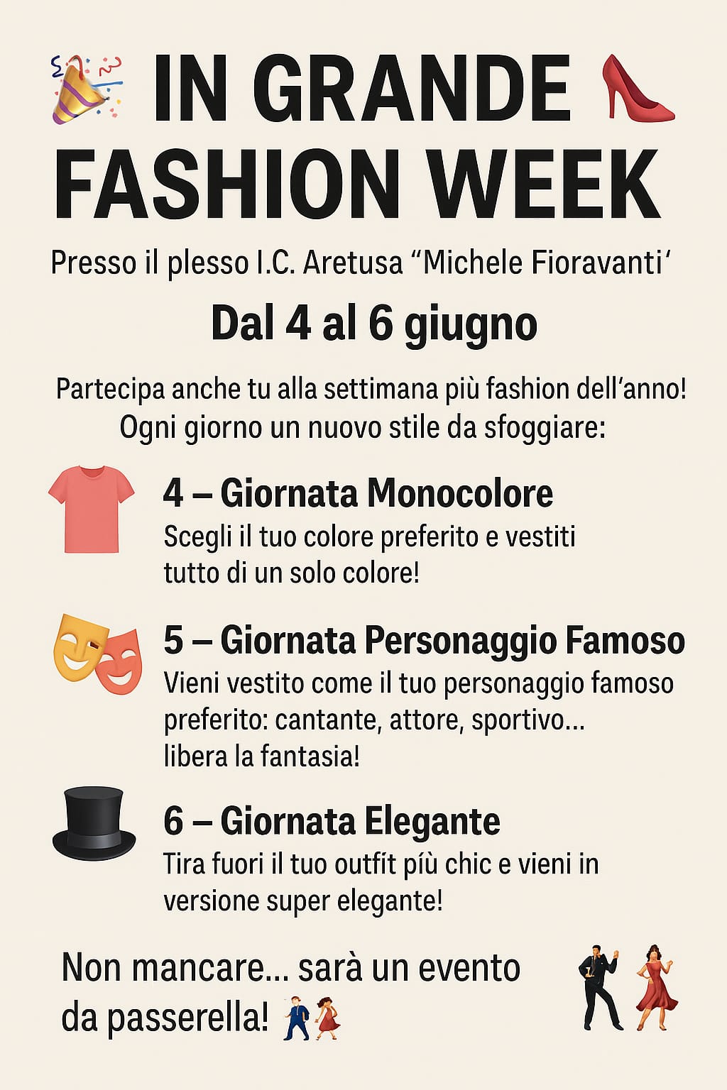 I giorni 4-5-6 Giugno saranno dedicati alla moda per alunni delle classi terze. Giornata monocolore, personaggio famoso e elegante!!!!